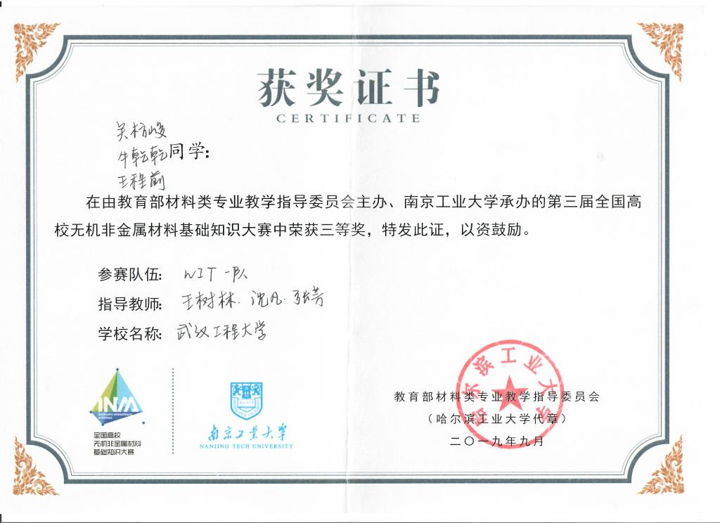 我校中国77779193永利集团派出无机非金属材料专业学生陈炳才、张天宇、胡淼组成的WIT二队(指导老师:沈凡 王树林 张芳)和吴枋峻、王程前、牛乾乾组成的WIT一队(指导老师:王树林 沈凡 张芳)参加了本届大赛,在众多高校的激烈竞争中,我校两支参赛队伍双双获奖。大赛分为预赛和决赛两个环节,在预赛环节我校两支参赛队表现优异,其中WIT二队在126支参赛队伍中以总排名第4的成绩进入到决赛环节,并在决赛中脱颖而出,斩获一等奖,展现了我校学子扎实的专业基础和勇创争先的精神,也凸显了学校对专业基础知识教学的高度重视。