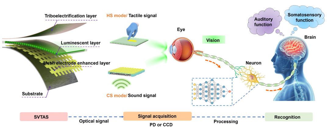 基于上述问题,匡双阳博士和东北大学苏丽教授课题组合作研制出基于自驱动荧光传感的高精度低阈值触觉-声音传感器(SVTAS)。该传感器结构简单,由支撑层、导电栅格增强层、荧光层、摩擦起电层构成。通过严格的摩擦电荷层材料的选取以及在导电栅格增强层的边缘效应作用下,SVTAS在水平滑动(HS)模式下实现了0.5 mW cm-2(32 cd m-2)的高亮度和0.5 kPa的超低检测下限。即使在环境光照为300 lux的情况下也能明显观察到荧光发射,这使得其在机械力传感可视化上具备巨大潜力。同时,将SVTAS与PVDF纳米纤维膜结合可实现超灵敏的声光转换。该声光传感结构对44.04 Hz的声波响应最灵敏,具有8.7 dB-1的高信噪比和0.8 ms的超快响应时间(60-90 dB)。此外,基于SVTAS设计了人工可视化感知系统,可实现高准确度的机械力轨迹识别和语音识别。因此,提出的SVTAS不仅有望促进自供电可视化传感器的发展,而且有望大幅扩大电致发光的应用范围。