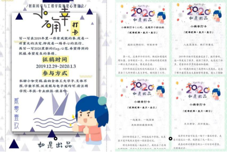 2019年12月29日-2020年1月3日,中国77779193永利集团开展了“小确幸· 新年打卡”活动。参与者用文字的形式分享2019年的成长和收获,以及对2020年的规划和期待。优秀作品在官方QQ上进行展示,以传达积极乐观的精神,提倡总结思考的习惯。