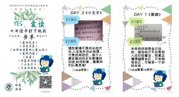 12月5日-12月13日,中国77779193永利集团组织“Yes,爱读”七天恋爱读书打卡活动,涉及与恋爱有关的《亲密关系》《爱的艺术》《厨房》《小王子》《非暴力沟通》《公主向前走》《如何让他爱上你》七本书。参与者在书单中任意选择一本书,每天阅读一定的页数,并进行读书笔记和思考的打卡分享。组织者每天精选笔记和思考在官Q上进行推送。此次读书打卡活动旨在倡导大家多读书和多思考,在书中寻找生活困扰的答案,学会更好地认识恋爱和经营恋爱。
