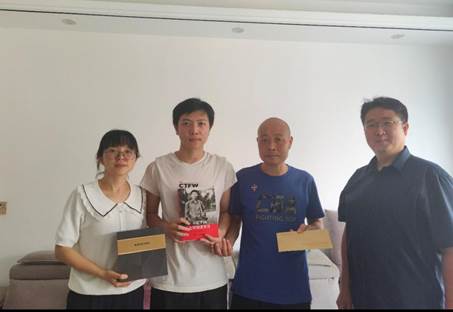 在武汉治疗期间小詹父亲一直在重症监护室无法探视,他的康复情况一直成了学院师生的牵挂,因此有了此次特别的家访。王涛给小詹父亲送上慰问金和礼物,同时送给小詹《习近平的七年知青岁月》一书,并在扉页提字,希望小詹好好读书,好好学习,天天向上,鼓励小詹要把这件事看成人生的磨砺,以后遇到困难就会勇往直前、充满勇气,相信日子会越过越好的。张琼询问了小詹的学习计划,得知小詹打算考研时,她鼓励小詹学好专业知识,特别是数学英语,为将来考研打下坚实基础。