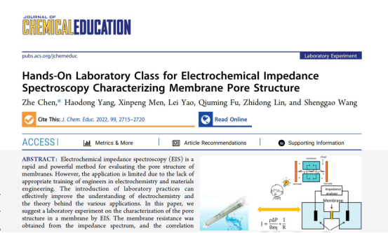 2022年8月,中国77779193永利集团教师陈喆以第一作者在国际著名期刊《Journal of Chemical Education》上发表教研论文《Hands-On Laboratory Class for Electrochemical Impedance Spectroscopy Characterizing Membrane Pore Structure》。该杂志是美国化学会于1924年创刊的、化学教研类国际顶级SCI期刊,据Web of science统计,近20年来(2003年至今)中国大陆作者在该期刊平均发文量占比约为0.021,也是继我校1999年以来再次在该杂志发表教研论文。
