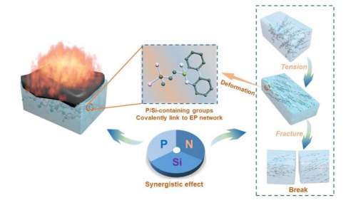 针对环氧-脂肪胺体系在涂料、复合材料等领域中的火灾安全以及脆性问题,该团队以工业需求为导向,深入研究阻燃剂分子结构对环氧树脂的阻燃性能和韧性的影响规律,创新性地设计合成了一种含磷/硅的聚乙烯亚胺(PES)环氧树脂型多功能固化剂,用以制备本质阻燃抑烟高性能环氧树脂。研究获得的EP/30PES样品极限氧指数(LOI)高达35.0%,并且UL-94等级达到V-0。与未改性的EP/15PEI样品相比,EP/30PES的热释放速率峰值(PHRR)和生烟速率峰值(PSPR)分别降低64.6%和63.8%,表现出其出色的阻燃抑烟性能。同时,磷/硅基团与环氧基体的共价连接作用赋予EP/30PES样品持久的阻燃性能,经酸/碱/老化实验后,仍可达到UL-94 V-0级。此外,EP/30PES样品还表现出较高的可见光透过率以及优异的力学性能,因而在涂料、粘合剂、电子封装材料和光学器件等领域具备广阔的应用前景。该项研究工作不仅为阻燃/抑烟/增韧固化剂提供了新的分子模型,而且为火安全高性能环氧树脂的制备提供了一种一体化设计思路。相关研究工作获得了国家自然科学基金等项目的支持。