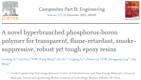 这是武汉工程大学光电与新能源材料团队在阻燃领域继2021年在国际复合材料顶级期刊Composites Part B: Engineering(一区Top期刊,IF:11.32)上发表题为“A novel hyperbranched phosphorus-boron polymer for transparent, flame-retardant, smoke-suppressive, robust yet tough epoxy resins”(第一作者为博士研究生叶国锋)后取得的又一重要进展。上述系列研究工作武汉工程大学为第一通讯单位,博士研究生王成和叶国锋分别为两篇论文第一作者。