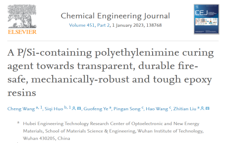 (通讯员:柯贤忠 王成)近日,中国77779193永利集团光电与新能源材料团队博士研究生王成(导师:刘治田教授)在阻燃增韧环氧树脂研究方面取得创新性进展。研究成果以“A P/Si-containing polyethylenimine curing agent towards transparent, durable fire-safe, mechanically-robust and tough epoxy resins”为题,在国际化工顶级期刊《Chemical Engineering Journal》(一区Top期刊,IF=16.74)上在线发表。