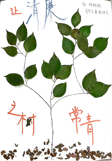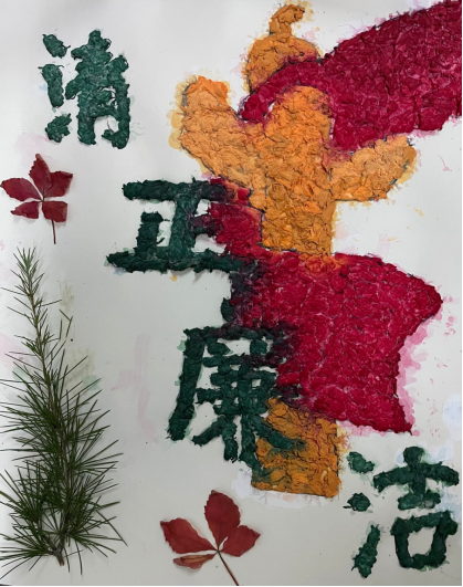 作品用废弃的纸盒、落叶、树根为材料制作而成。落叶修饰边框,代表着深入底层的工作人员一身“廉洁自律”的正气,在祖国的大地上如落叶温养土地般辛劳工作。旁边被斩断的树根则代表一切腐败的源头要从根部扼止。