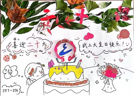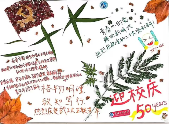 以蛋糕做底庆贺建校50周年,树叶和草代表在党和国家的关爱下,人民生活欣欣向荣,中间倒着的月亮拥抱着校徽代表党和国家的光芒照耀工大校园,青年大学生在这美好时代矢志奋斗。