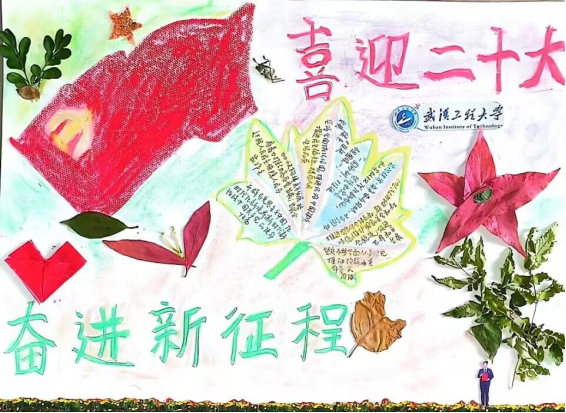 红色和黄色的树叶拼凑了一面鲜红的党旗,四叶草寓意幸运,热烈庆祝党的二十大胜利召开。如满天繁星的桂花,正是我们一代代工大学子跨越时空,为母校送上最真挚的祝福。