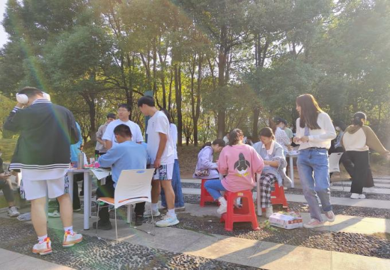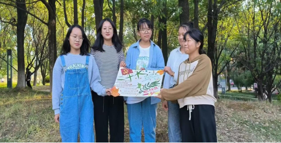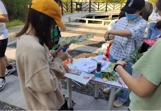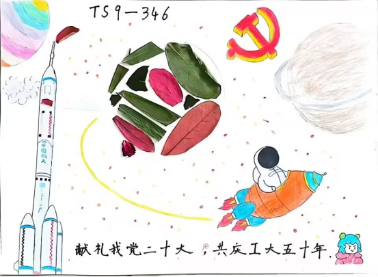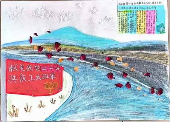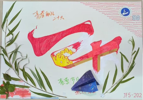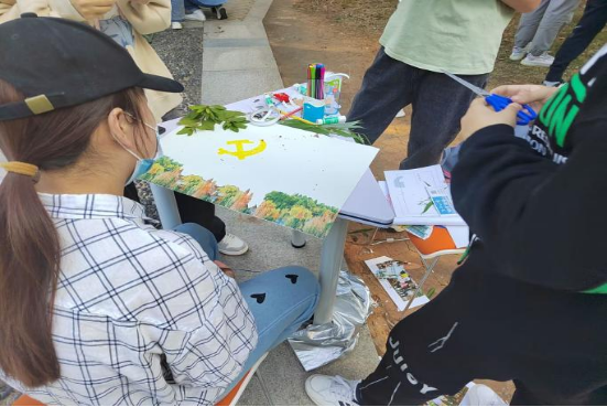 线下活动过程中,同学们围坐在静心湖畔,利用随处可见的落叶、小草、花朵、筷子、废旧纸箱、糖纸等材料,配合以彩笔勾勒线条,将奇思妙想呈现在作品上。以此为党的二十大献礼,祝福母校生日快乐。