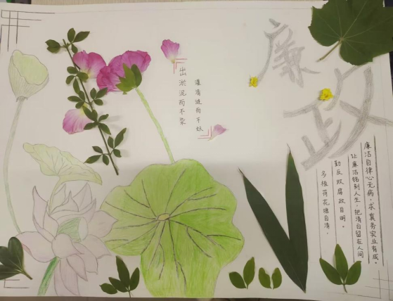 清正廉洁以身垂范,慎独自重洁身自强。作品中左侧的枝桠树叶既代表着清正廉洁施行下的中国枝繁叶茂、蓬勃发展。又代表着给人民带来的庇荫,为人民谋幸福;右侧是“清正廉洁”四个字中,“清”字带有毛笔字的古韵古味,体现出“清正廉洁”是中华民族的优良传统,源远流长,而“廉”字以荷花34的形态展示出来,以莲的品性比如“廉洁”的可贵品德。