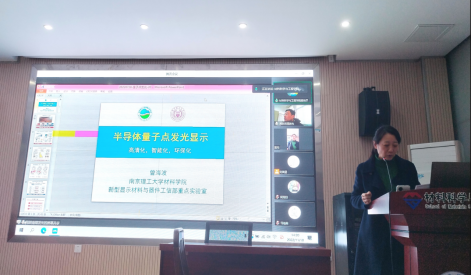 曾海波教授以《半导体量子点发光显示:高清化,智能化,环保化》为题开展讲座。他重点介绍了课题组在新体系量子点方面的研究,包括钙钛矿量子点超纯三基色电致发光的首次发现、室温合成方法、Pe-QLED器件缺陷钝化及再生抑制策略、基于单层半导体的白光LED的提出、可见光通讯、空间辐射探测及能量转换等方面的进展。与谈环节中,曾教授表示了与我校教师的友好情谊,并对大家前往南京理工大学继续深造表达了殷切期待。