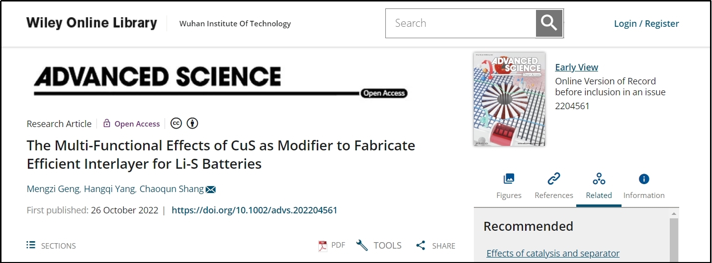 (通讯员:刘凡)近日,我校先进储能材料与器件团队商超群博士基于锂硫电池的深入研究,提出了一种改善电池性能的新思路,并通过理论分析和实验表征,对其可行性进行了验证,相关结果以"The Multi-Functional Effects of CuS as Modifier to FabricateEfficient Interlayer for Li-S Batteries"为题发表在国际知名学术期刊《Advanced Science》(响因子为17.52,中科院一区TOP)上。武汉工程大学为论文第一单位,商超群博士为唯一通讯作者。