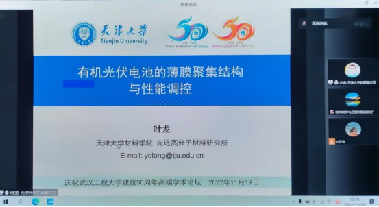 作为我校2010届校友,叶龙教授首先回顾了自己在母校期间的经历,并对母校50周年华诞表示了热烈的祝贺。随后,叶龙教授以《有机光伏电池的薄膜聚集结构与性能调控》为题进行了学术讲座。