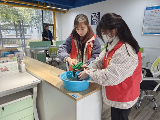 志愿者们相互配合、分工明确,在一次次地清扫垃圾、一次次地擦净灰尘、一次次地铲除顽固污渍中,学生社区很快变得明亮、整洁起来,为迎接微特们做好充分地准备。