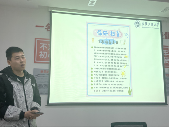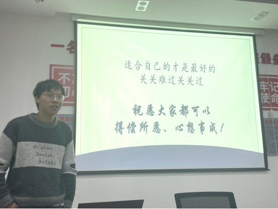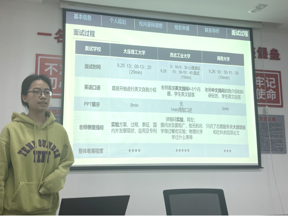 分享会上,杜元开从保研流程、简历的制作、文书的准备以及如何进行自我介绍四个方面分享了自己推免至天津大学的经历,他还强调同学们即使获得了推免资格也要沉下心来,保持不断求知的学习精神。