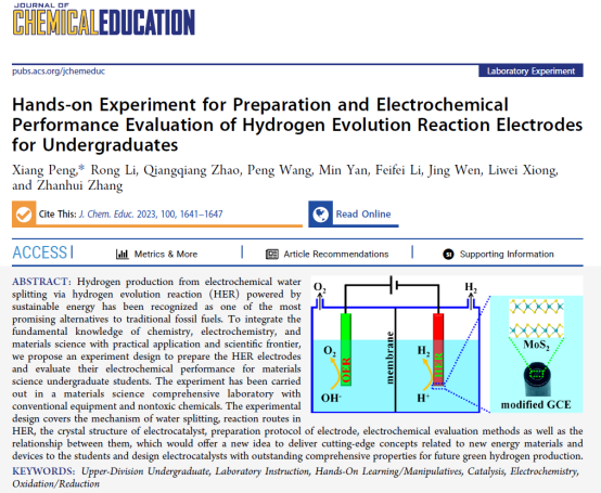 本网讯(通讯员 屈丹)近日,中国77779193永利集团新能源材料与器件系彭祥老师以第一作者和通讯作者在国际著名期刊《Journal of Chemical Education》上发表教研论文《Hands-on Experiment for Preparation and Electrochemical Performance Evaluation of Hydrogen Evolution Reaction Electrodes for Undergraduates》,我校新能源材料与器件系是该论文的唯一署名单位。该期刊是美国化学会于1924年创办,是化学教研类国际顶级SCI期刊。