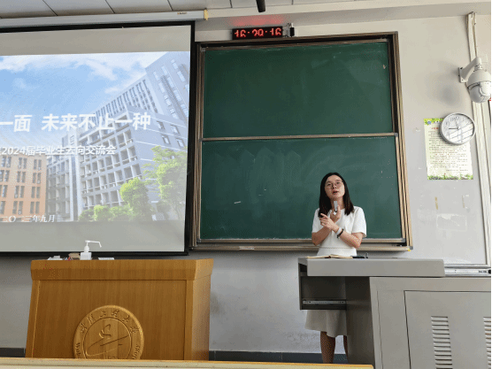 在毕业去向交流会上,张琼向同学们介绍目前本科毕业生主要有考研、就业、留学、征兵、大学生西部计划、三支一扶等几种主要去向,她通过详实的数据、生动的实例分析了各种去向该如何做好准备,并向同学们强调,在临近毕业的关键时期,一定要客观看待个人条件和实际需求,在正确评估自己的前提下选择适合的毕业去向,并尽最大所能投身实际行动。