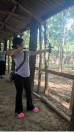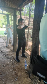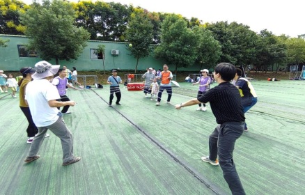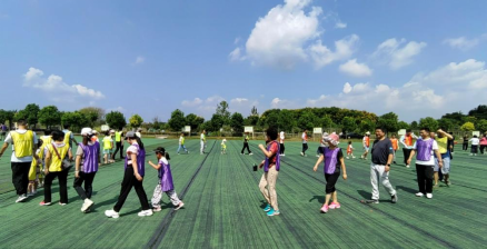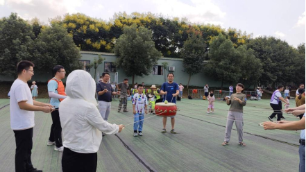 到达生态园后,在景区大门口集合签到、拍集体照,并由教练讲解行程安排和注意事项。随后在教练带领下,开展“三块五”、击鼓颠球等各项团建活动。